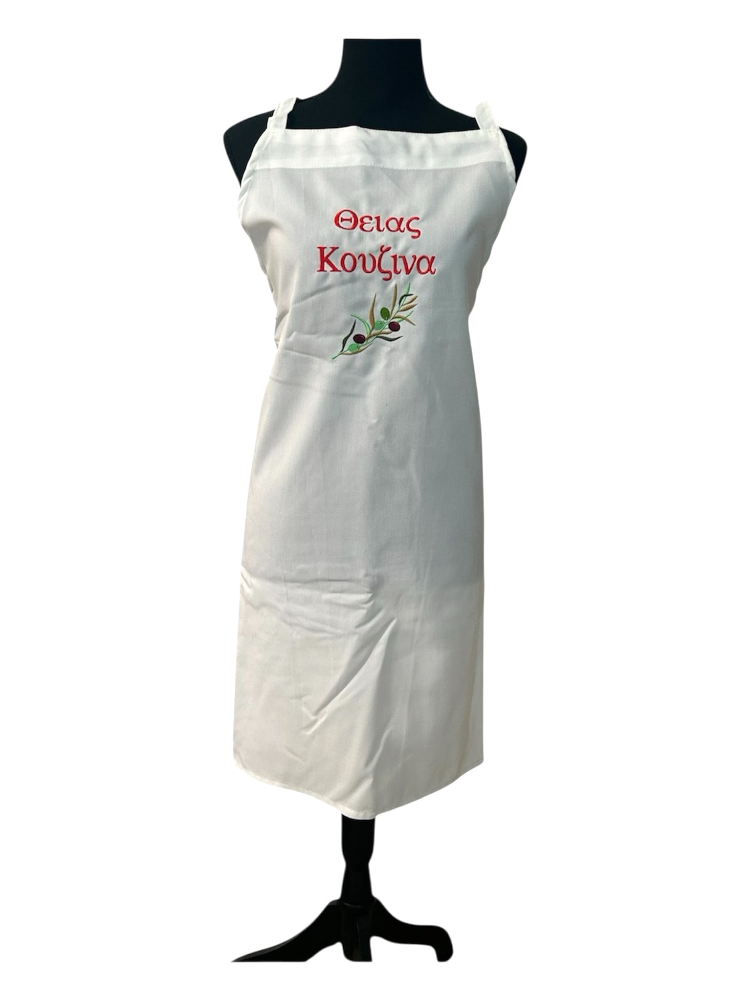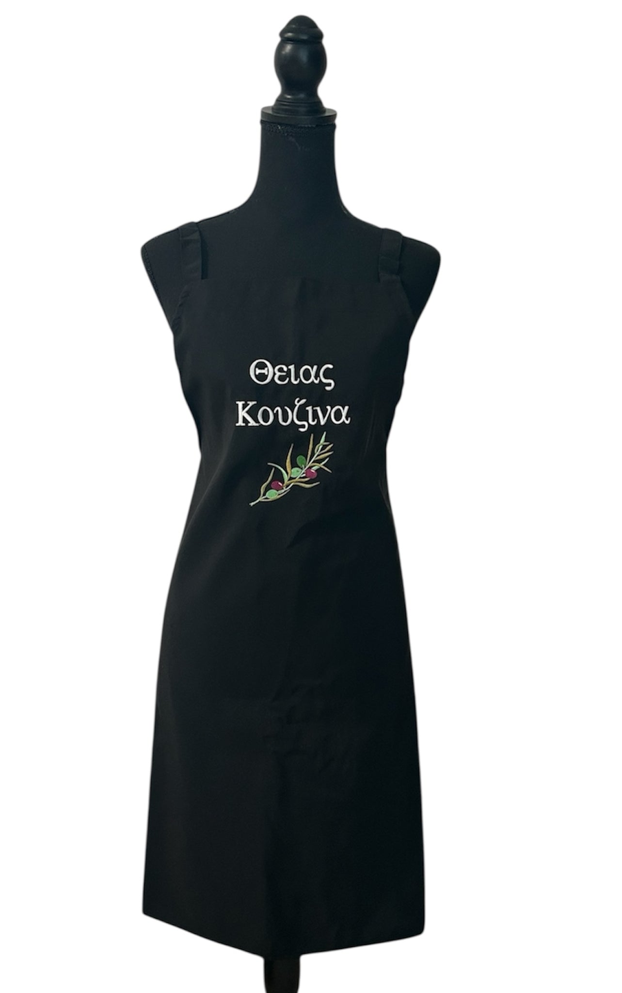 Celebrate the heart of the family kitchen with this beautifully embroidered “Theia’s Kitchen” apron, a special tribute to the aunt who fills the home with love, tradition, and incredible meals. Featuring a delicate olive branch designand elegant lettering, this apron brings a warm Mediterranean touch to every cooking or baking moment.
