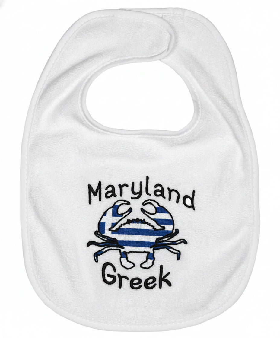 Celebrate your little one’s Greek heritage and Maryland pride with this adorable baby bib! Featuring a charming embroidered Greek crab design—a playful nod to Maryland’s famous blue crab—this bib blends tradition and local flair for a truly unique keepsake.