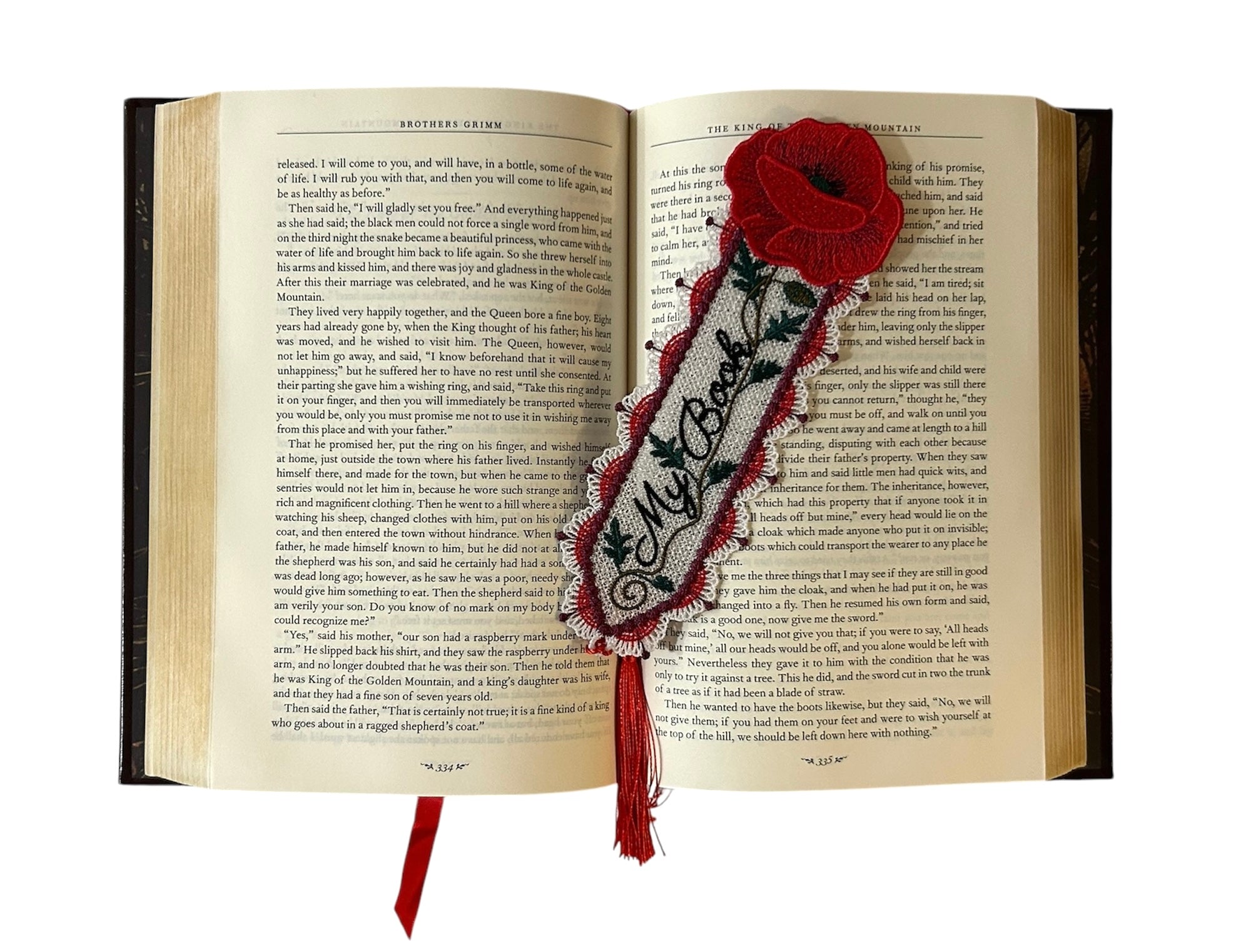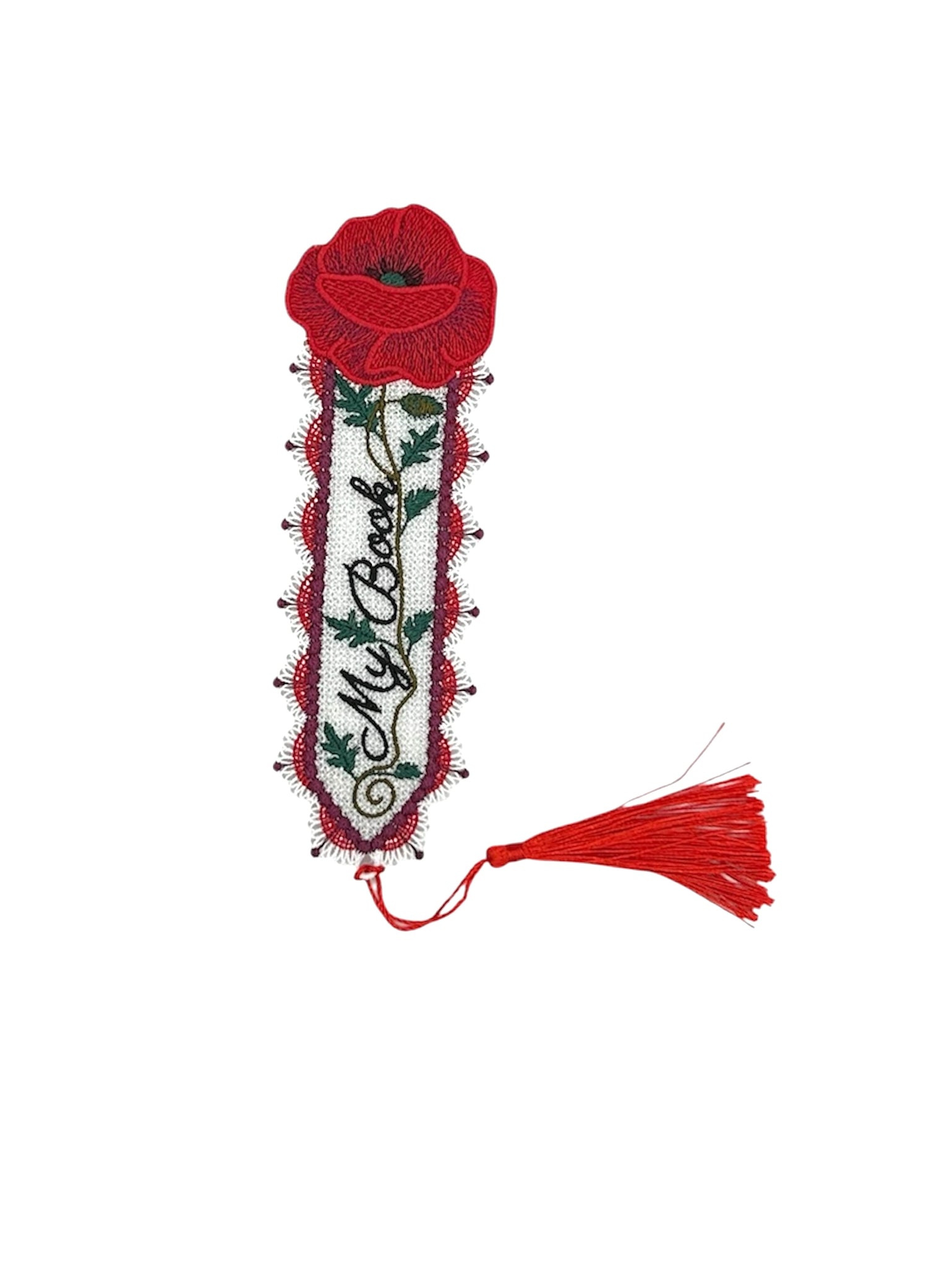 Poppy free standing lace (FSL) bookmark. Bookmark measures approximately 6.9" x 4.9".