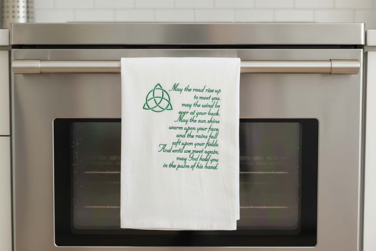 Add a touch of Irish warmth and tradition to your home with this embroidered Irish Blessing kitchen towel / tea towel, featuring a beautiful Trinity knot design. 🍀