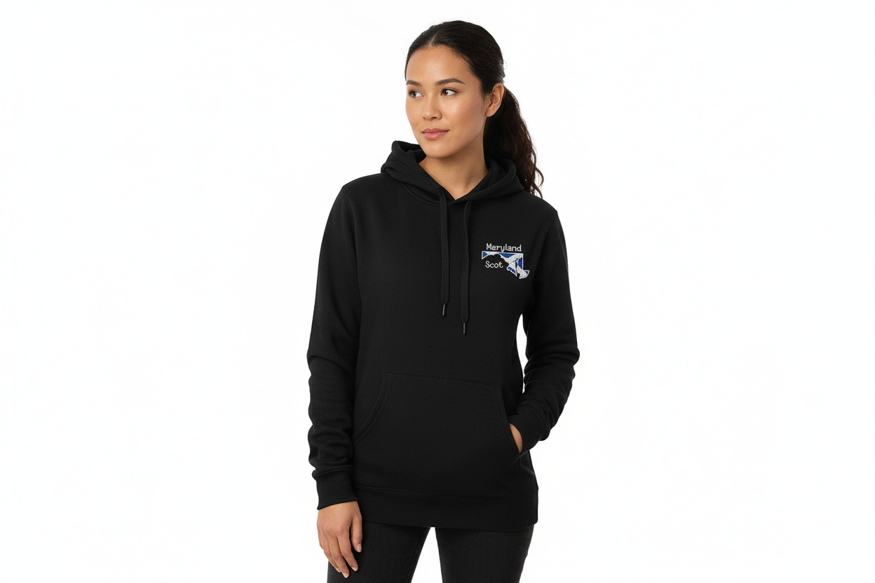 The crab—an iconic symbol of Maryland—is beautifully embroidered on the back in a bold Scottish-inspired design, paying tribute to the state’s deep connection to the Chesapeake Bay and maritime tradition. On the front, a smaller embroidered Scottish Maryland map is placed over the left chest pocket area, offering a subtle yet personal nod to state pride and Scottish heritage.