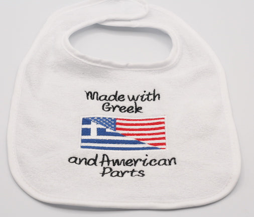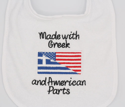 Celebrate a little one’s dual heritage with this adorable baby bib, featuring embroidered Greek and American flags and the playful phrase “Made with Greek and American Parts.” Stylish, and full of personality, it’s a fun way to honor both cultures from day one.