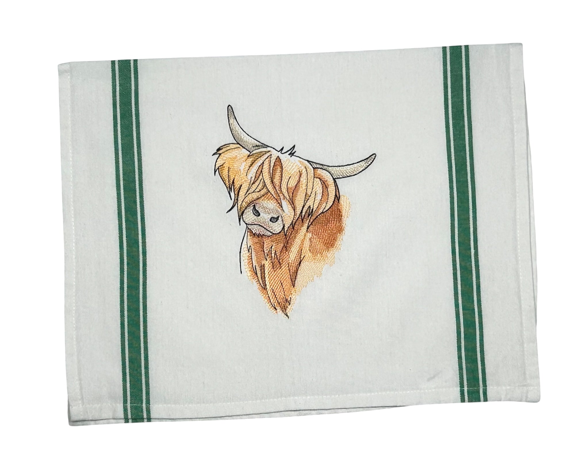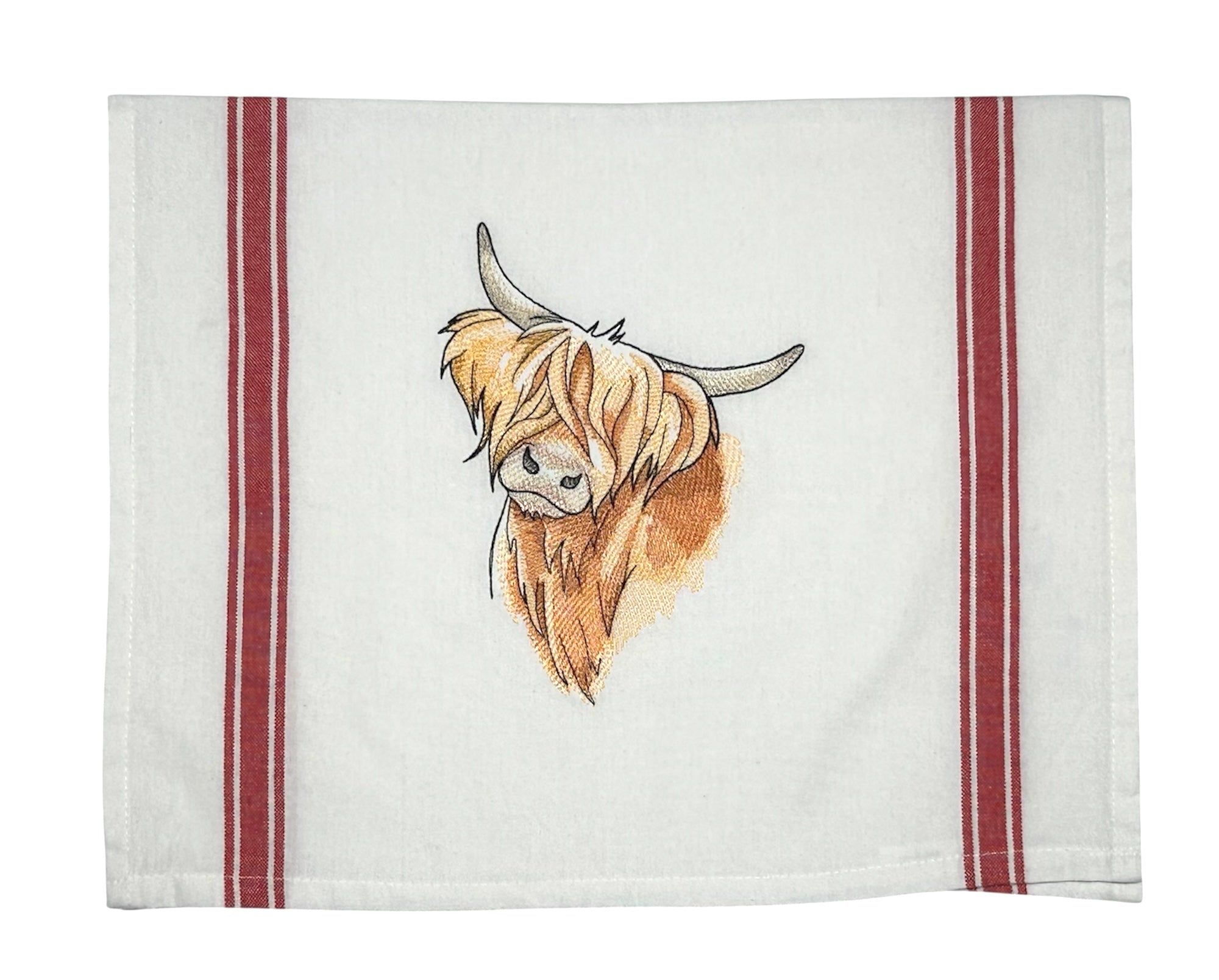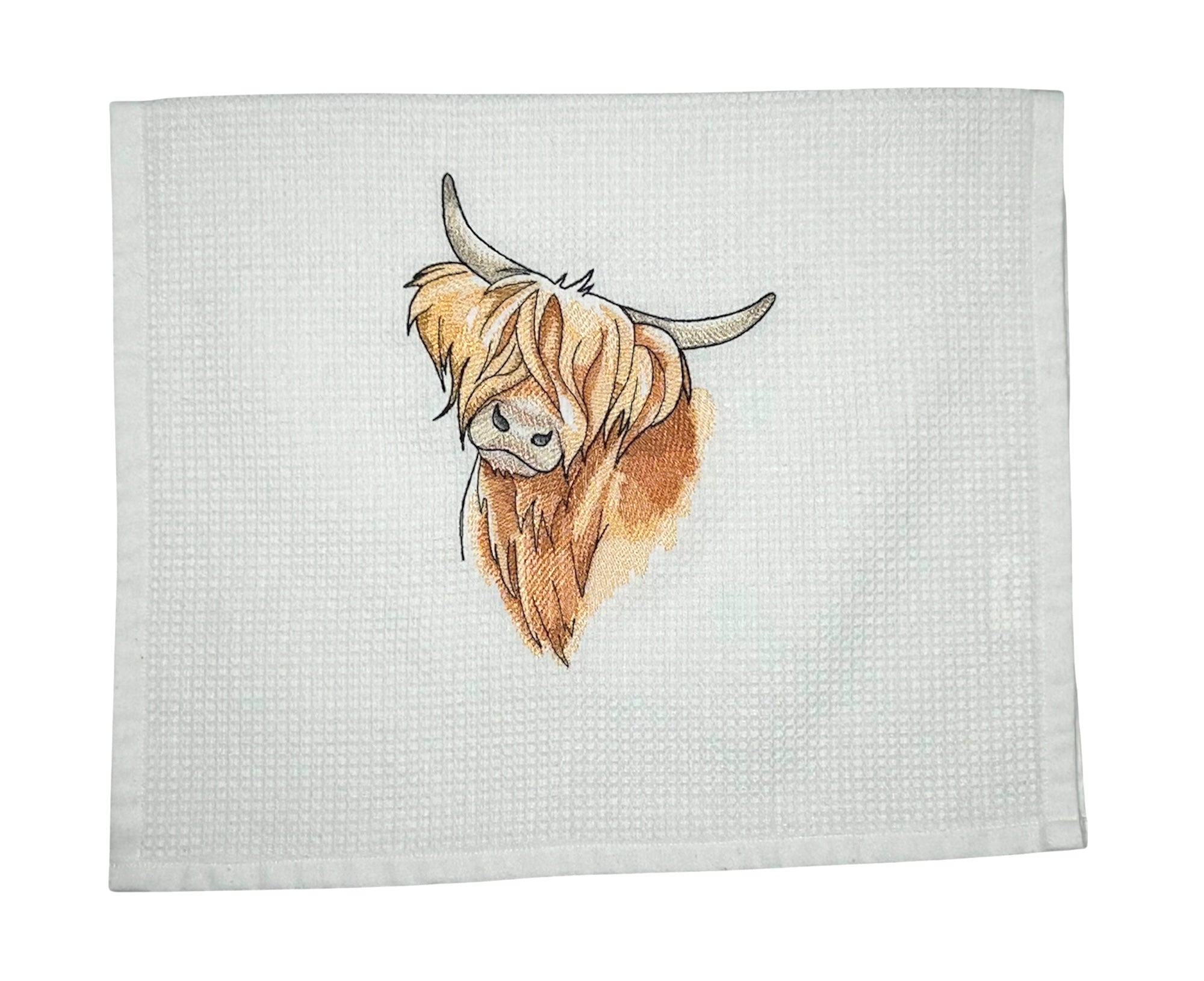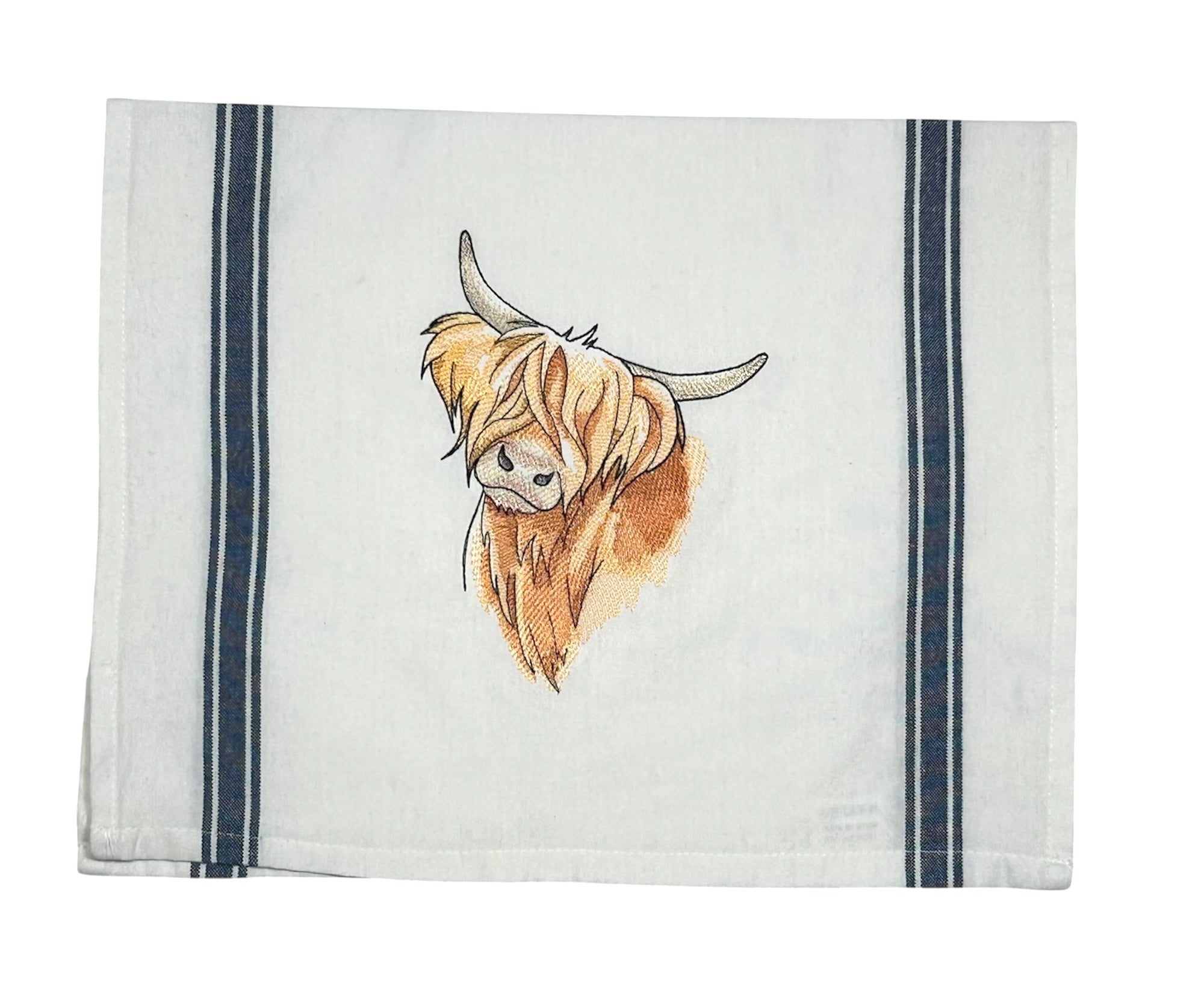 Embroidered kitchen towel with a quizzical Highland cow. A lovely addition to your kitchen.