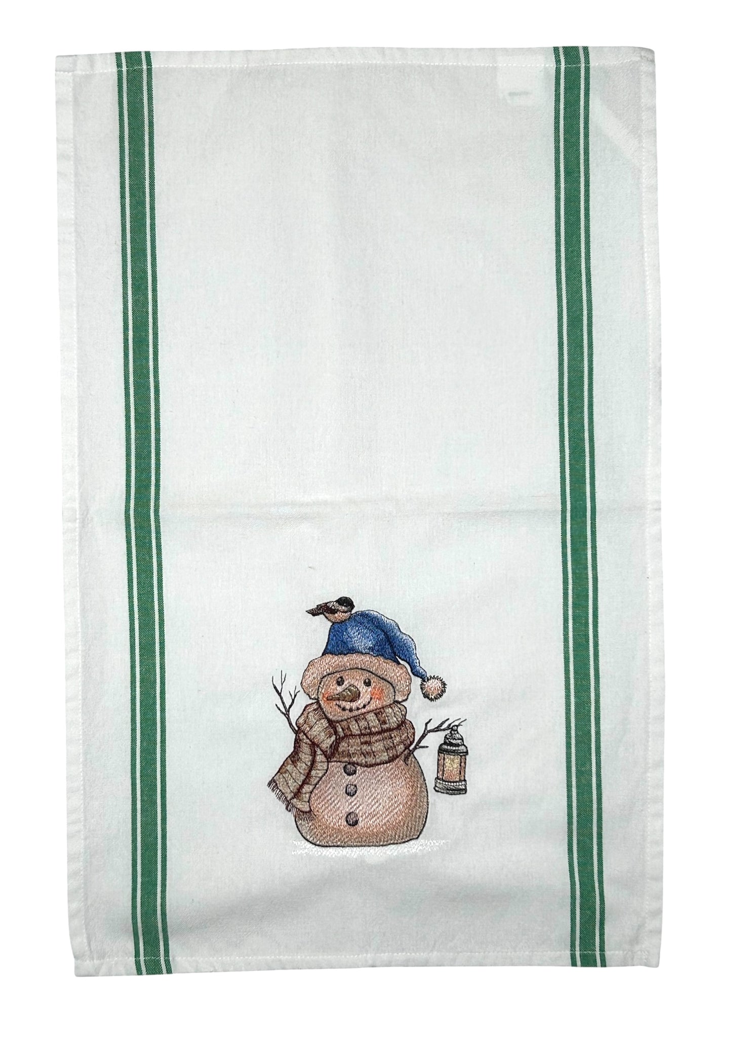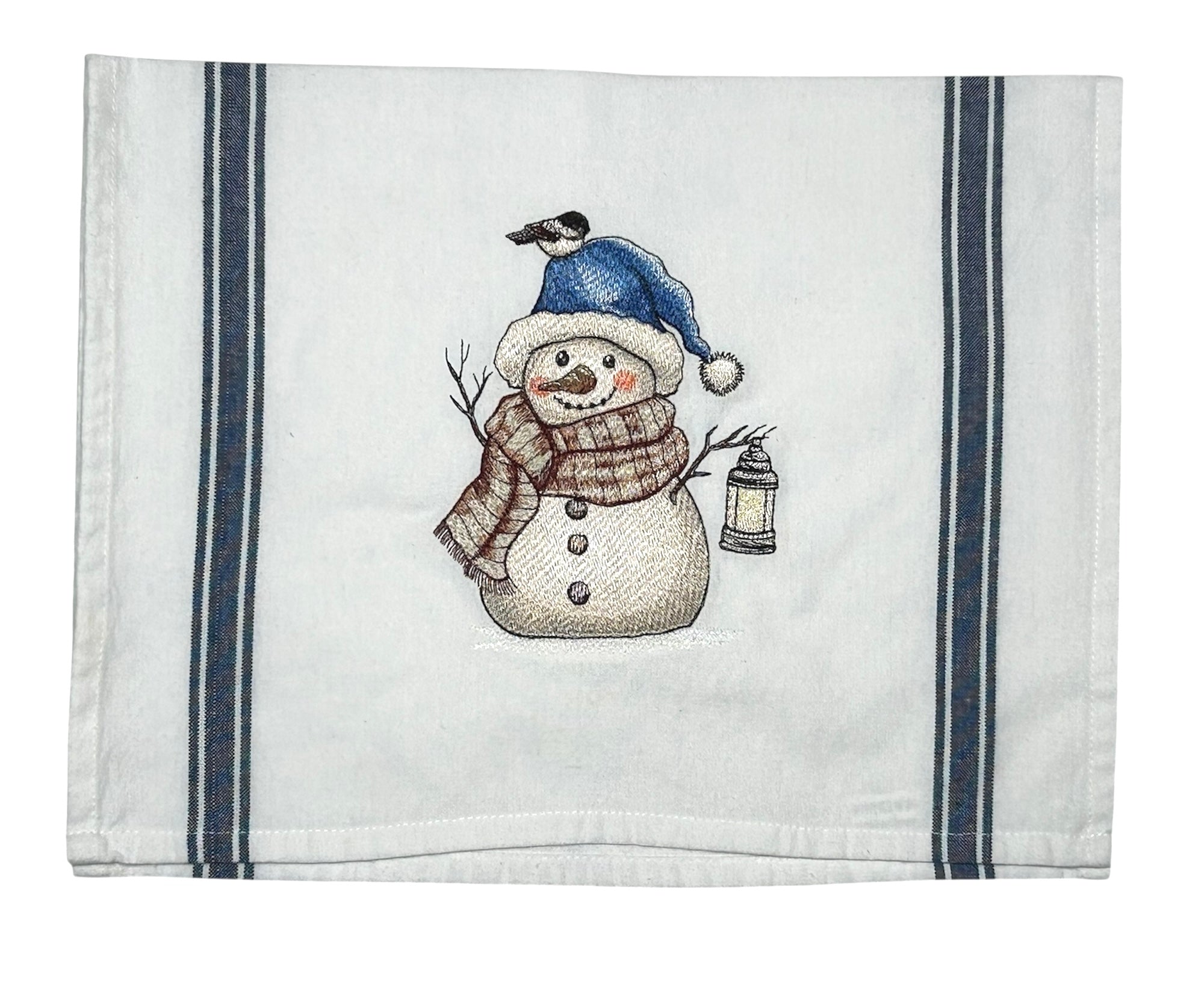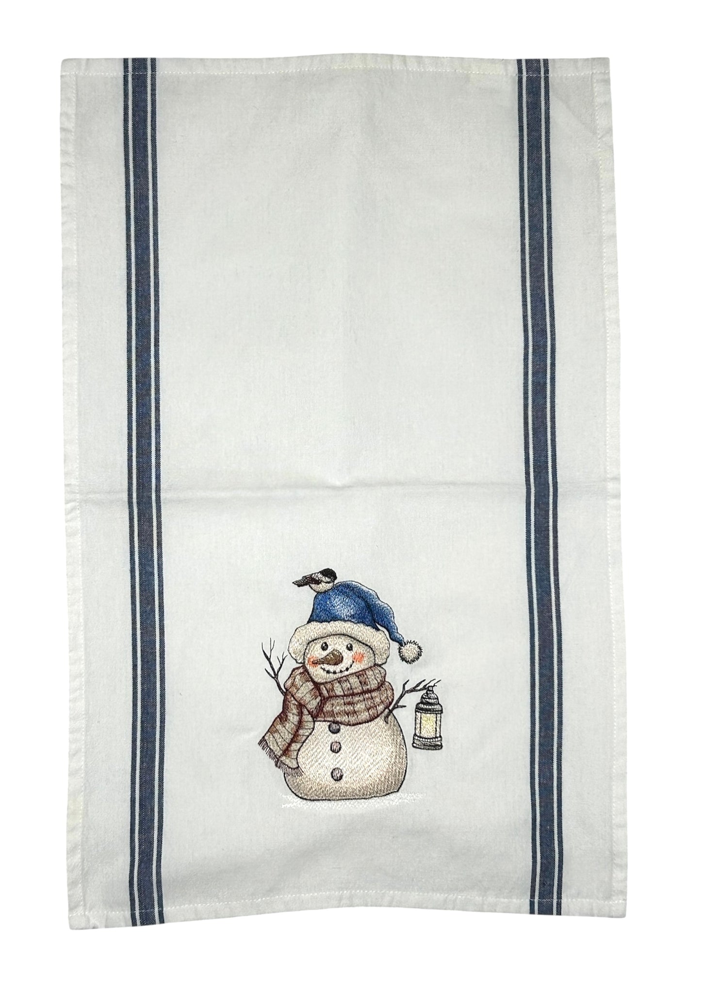 Embroidered kitchen towel with snowman design. A lovely addition to your kitchen.