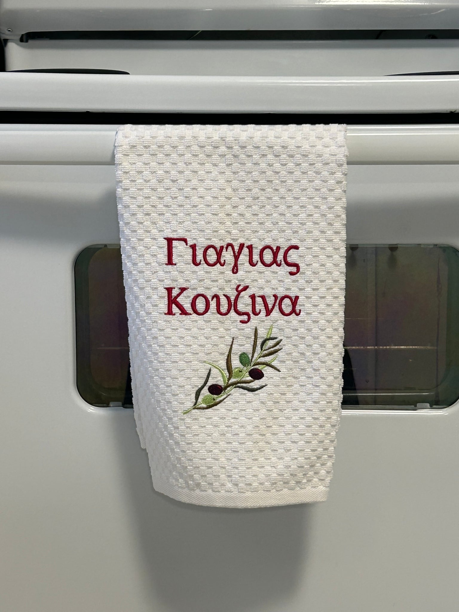 Celebrate the heart of the home with this beautifully embroidered “Yiayia’s Kitchen” towel, a sweet tribute to the grandmother who fills the kitchen with love, tradition, and amazing food. Featuring a delicate olive branch design and elegant lettering, this towel adds a warm Mediterranean touch to any kitchen.