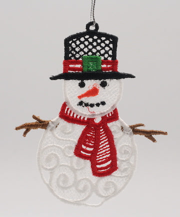 Snowman free standing lace (FSL) ornament.Ornament measures approximately 3.2" x 3.9".